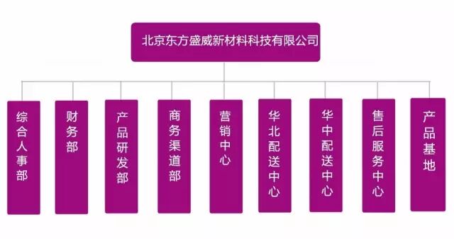 公司下设综合人事部、财务部、产品研发部、商务渠道部、营销中心、华北配送中心、华中配送中心、售后服务中心及产品基地共计9个部门。
