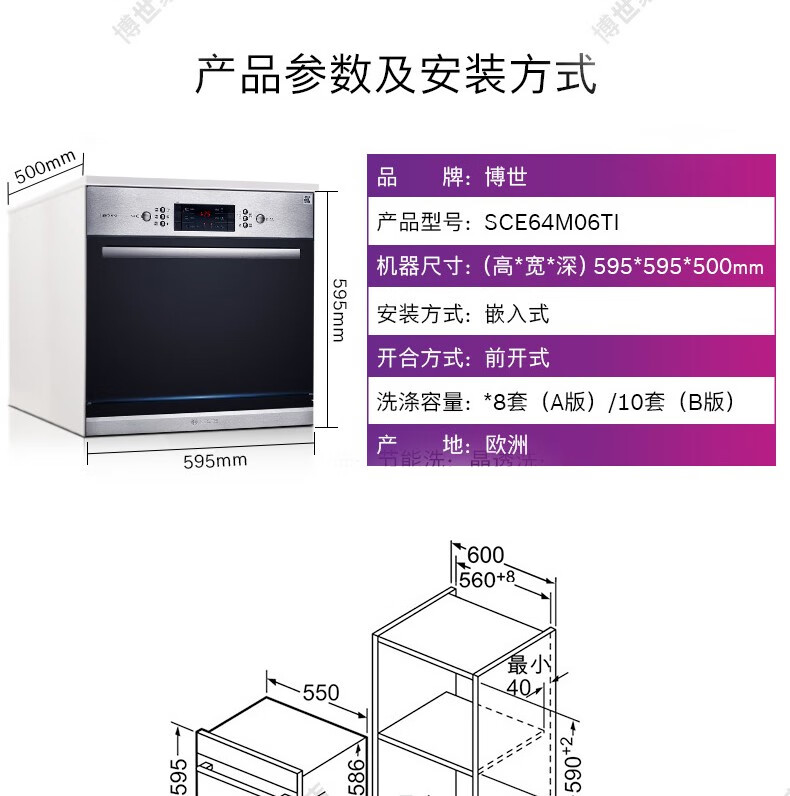 -4种增值功能: 少量餐具,加速省时,加强烘干,加强除菌 卓越功能,高效洗涤-5种洗涤温度选择:-EcoSilence Drive 环保静音驱动,-AquaSensor智能传感器,自动判断水浊度, LoadSenor负载传感器, 自动感应洗涤量