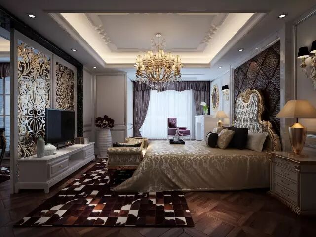 ▲室内多采用带有图案的壁纸、地毯、窗帘(简约欧式风格窗帘的代表花型是大马士革)、床罩、帐幔及古典装饰画,体现华丽的风格。