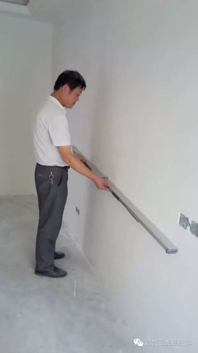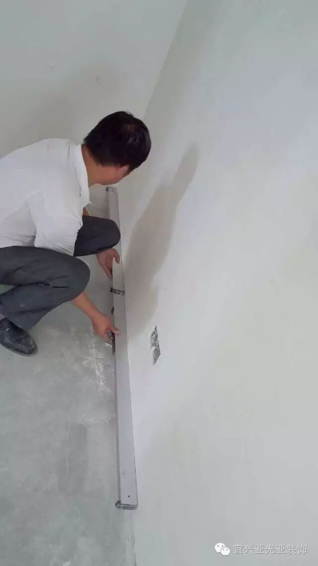 公司规定:两米长铝合金靠墙面、顶面、阴角、阳角、踢脚线、门边、窗边误差在两毫米以内,这就是普通公司和正规公司的区别!