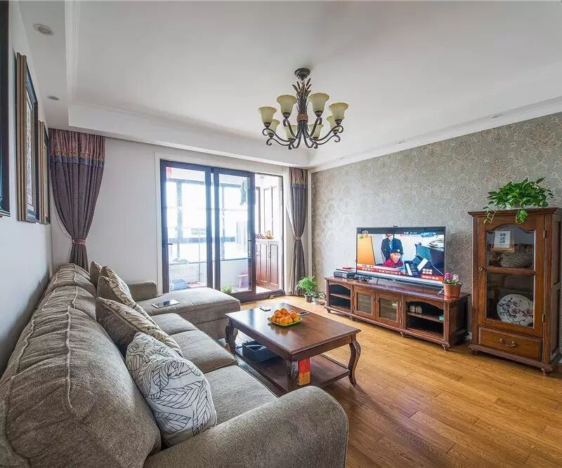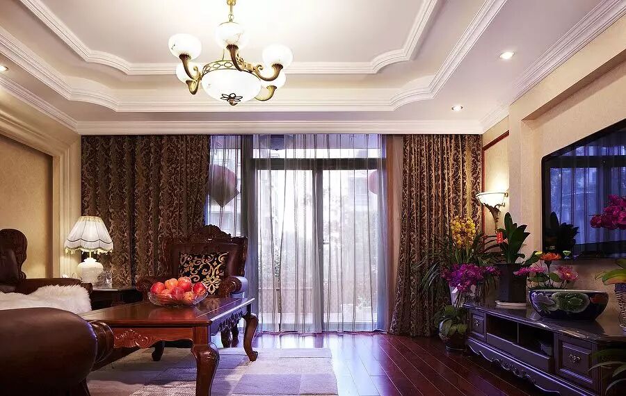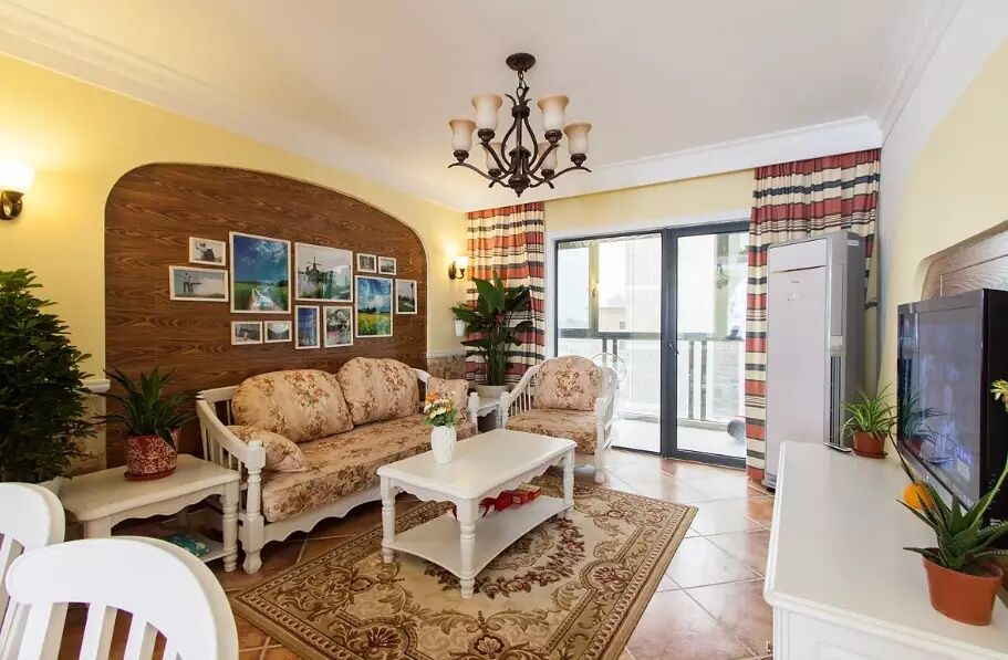 客厅作为待客区域,一般要求简洁明快,同时装修较其它空间要更明快光鲜,通常使用大量的石材和木饰面装饰;美国人喜欢有历史感的东西,这不仅反映在软装摆件上对仿古艺术品的喜爱,同时也反映在装修上对各种仿古墙地砖、石材的偏爱和对各种仿旧工艺的追求上。总体而言,美式田园风格的客厅是宽敞而富有历史气息的。