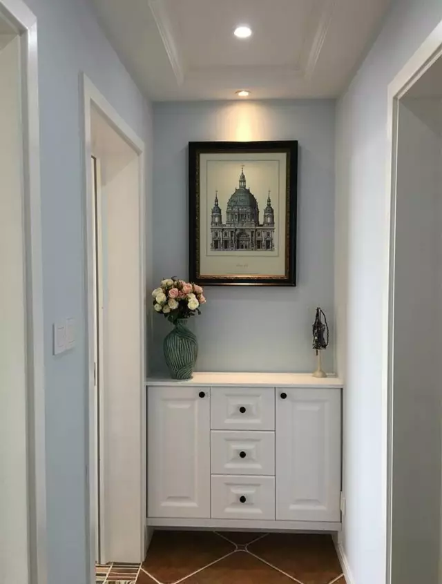 在走廊尽头摆上一个好看的边柜,搭配赏心悦目的插花盆栽,既可以装饰单调的走廊,边柜还能放置一下小杂物,收纳装饰两不误。