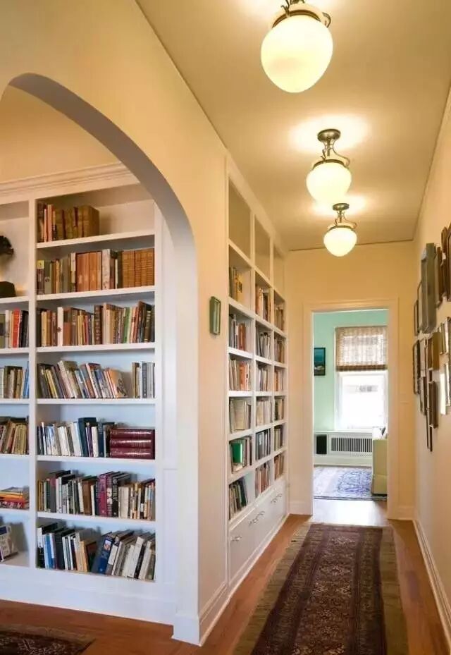 养成看书的好习惯,从拥有一面走廊书墙开始!利用搁板或者开放型的书架就能够轻松打造,谁家都可以。