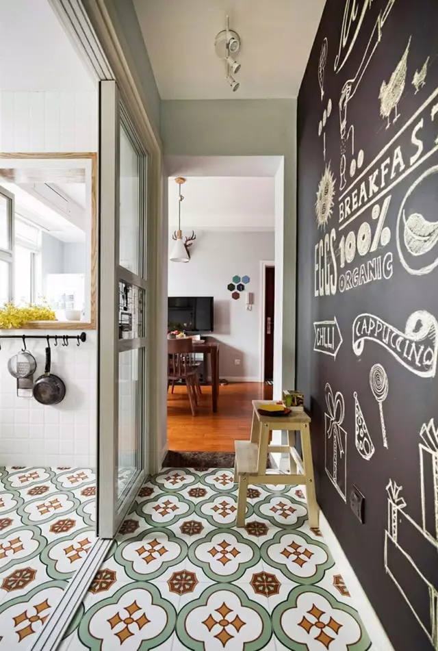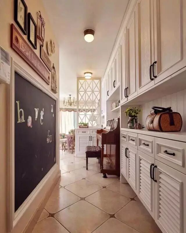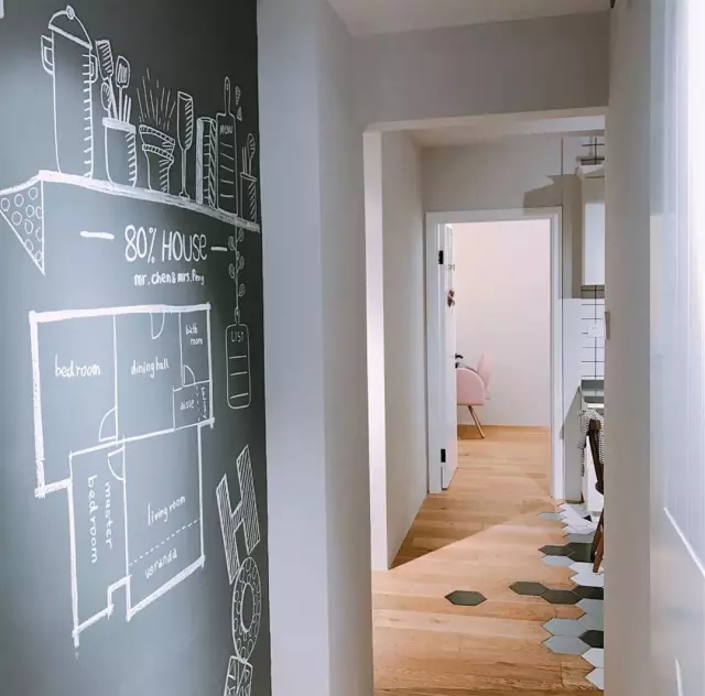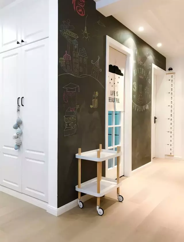 如果家里有小孩的情况,不妨把走廊的大白墙改成黑板墙,给小孩一个涂涂画画的小空间。有了黑板墙,再也不用担心大白墙被涂花了。相比大白墙,黑板墙的装饰效果充满童趣。
