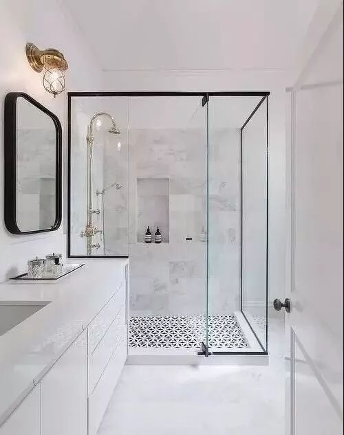 3、地面除了铺瓷砖,还有一种石材做法,中间一整块石材凸起,四周一圈排水(酒店房间淋浴常见),提前把地漏位置设计在靠边位置。