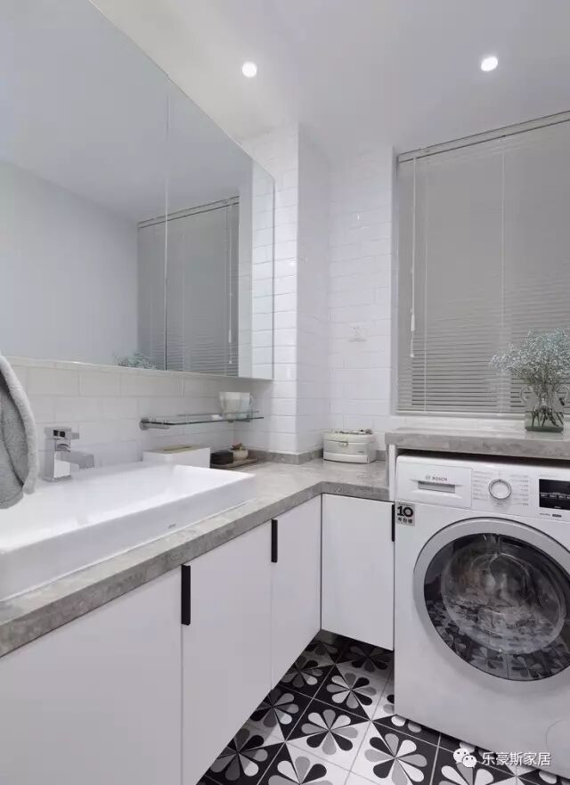 ▲洁白的墙面、暖色的台面、黑白灰的拼花地砖,让卫生间更具层次感。
