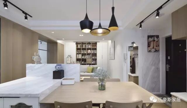▲白色条纹大理石储物柜搭配木色餐桌,清新自然、原生态。