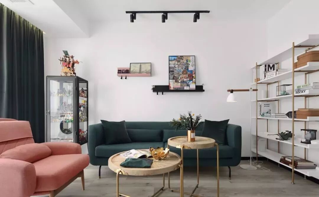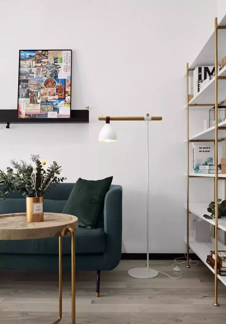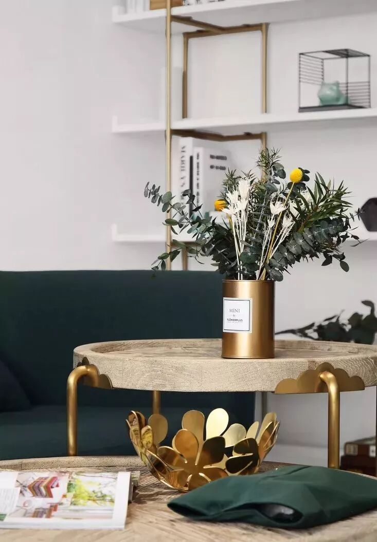 茶几上金色花瓣状果盘和金色光面花瓶点缀其中,使得整个空间中北欧风与复古情调兼具。