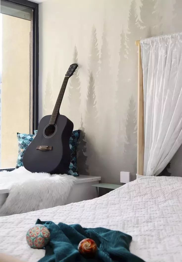床头边,一把黑色的吉他倚墙而放,随性洒脱,为整个房间增添了一些青春浪漫风情。