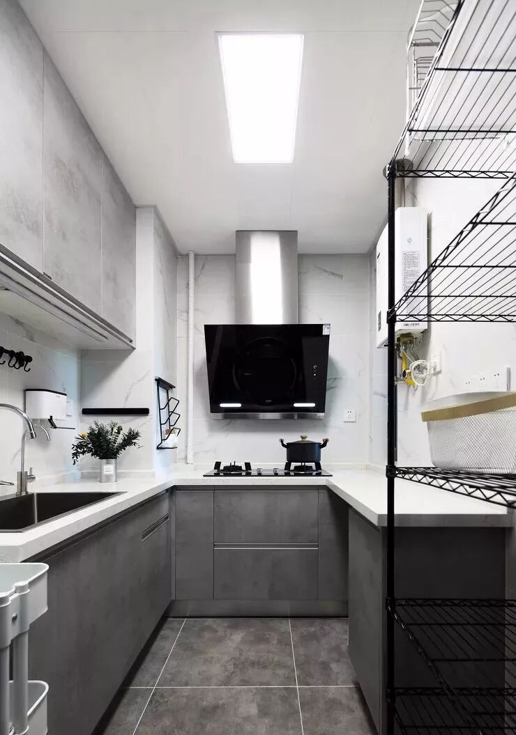 厨房以黑白灰为主色调,白色让采光本就弱的厨房更明朗通透,水泥灰的质感简单而沉稳。