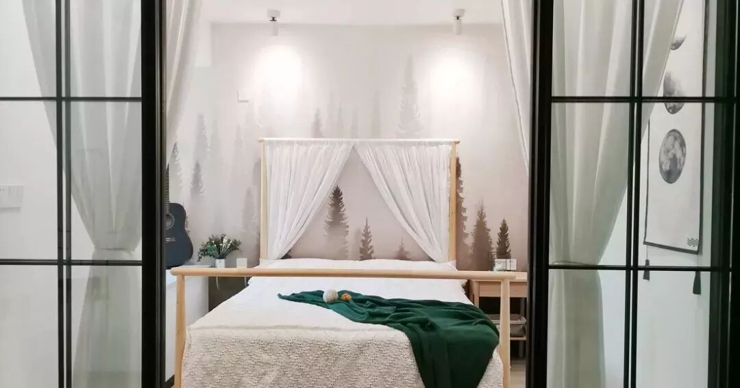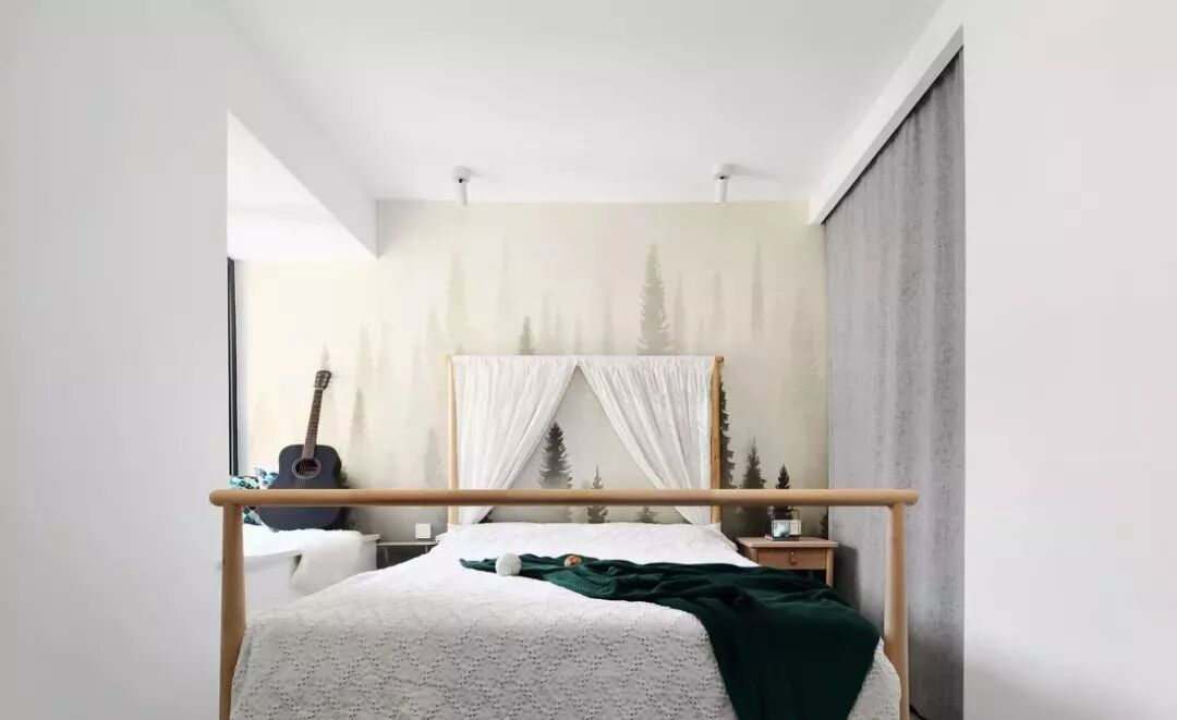 次卧,硬朗质感的黑框玻璃移门,清新别致的迷雾森林壁纸,带来硬朗与柔和的碰撞。双人床的自然原木色更增加了房间的森系空气感。