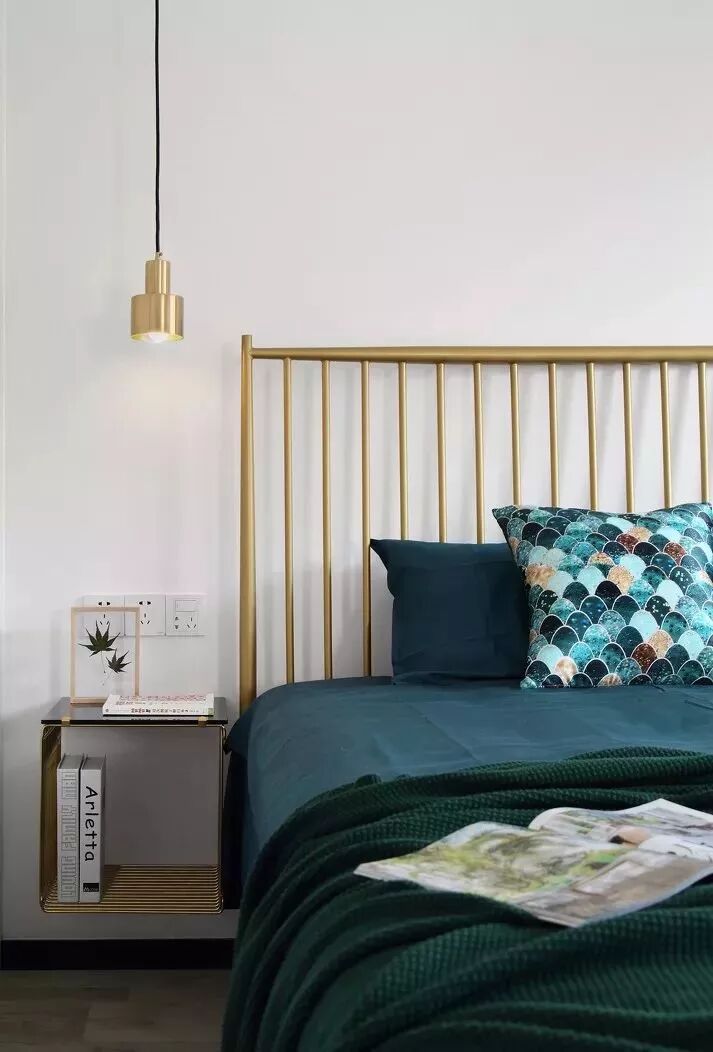 主卧选择了金色铁艺床,悬空的置物架取代了普通的落地床头柜,带来的轻盈感又减轻了色彩上的厚重感,一举两得。
