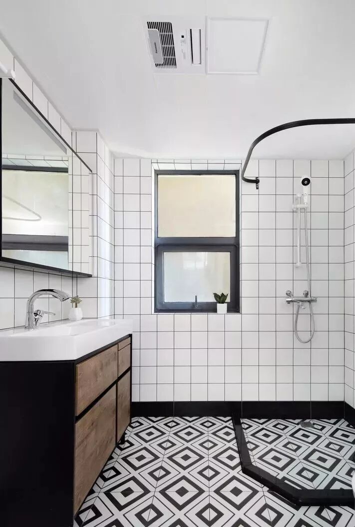 卫生间运用黑白反差对比花色的墙地砖进行铺贴,墙砖底部的黑色脚线围边,承上启下将墙砖和地砖巧妙过渡,不会使整个空间过于单一而乏味。