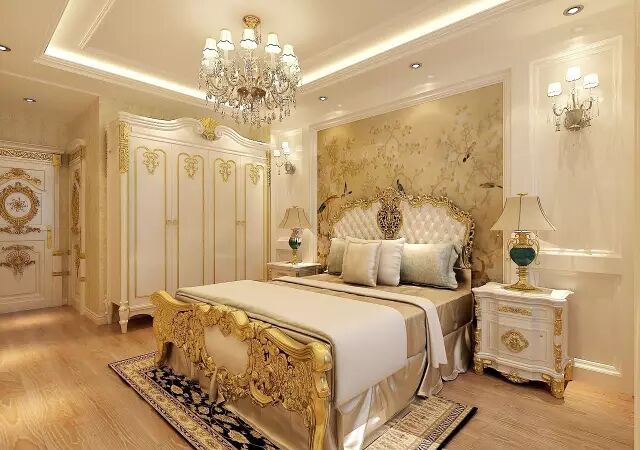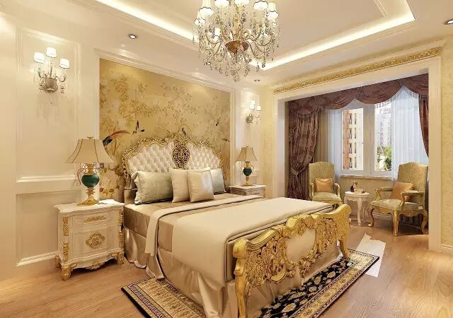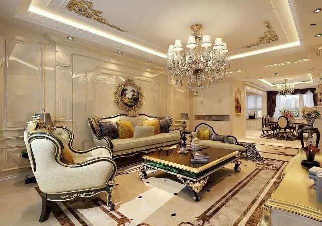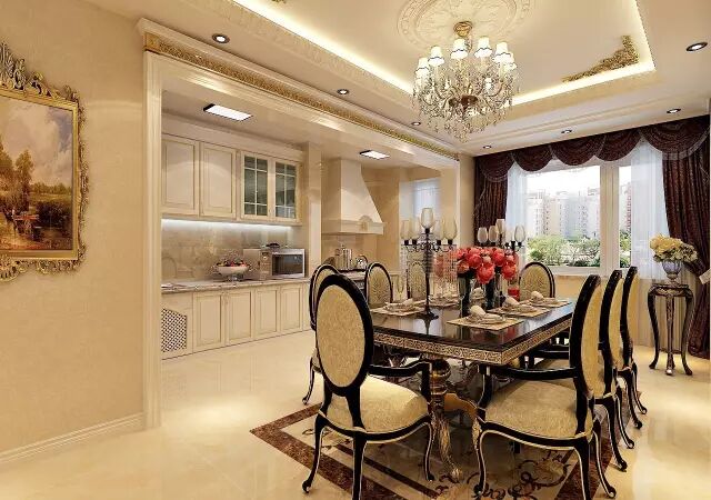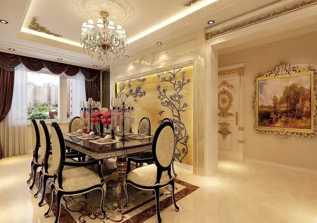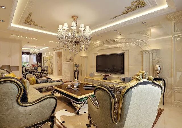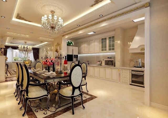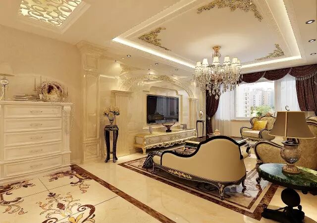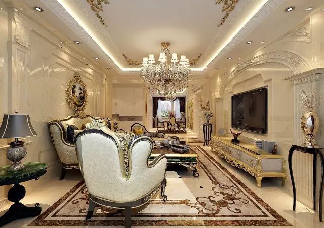 150㎡三居户型大面积使用大理石铺贴,天然纹路展示浑然天成的大气。家具以欧式刻花装饰,金色勾边呈现独有的奢华贵气。