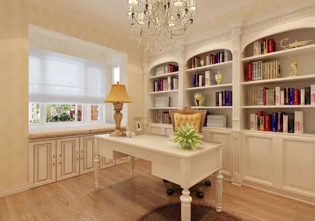 简洁的书房,开放式书架设计加入了欧式的拱门和柱形雕花,很有古典的欧洲既视感。
