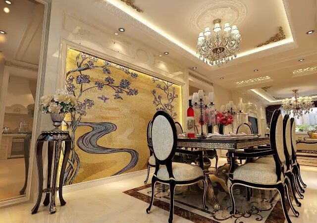 背景墙偏中式风,花鸟仙境由小小的马赛克砖一点点拼贴成型,渲染协议浪漫。