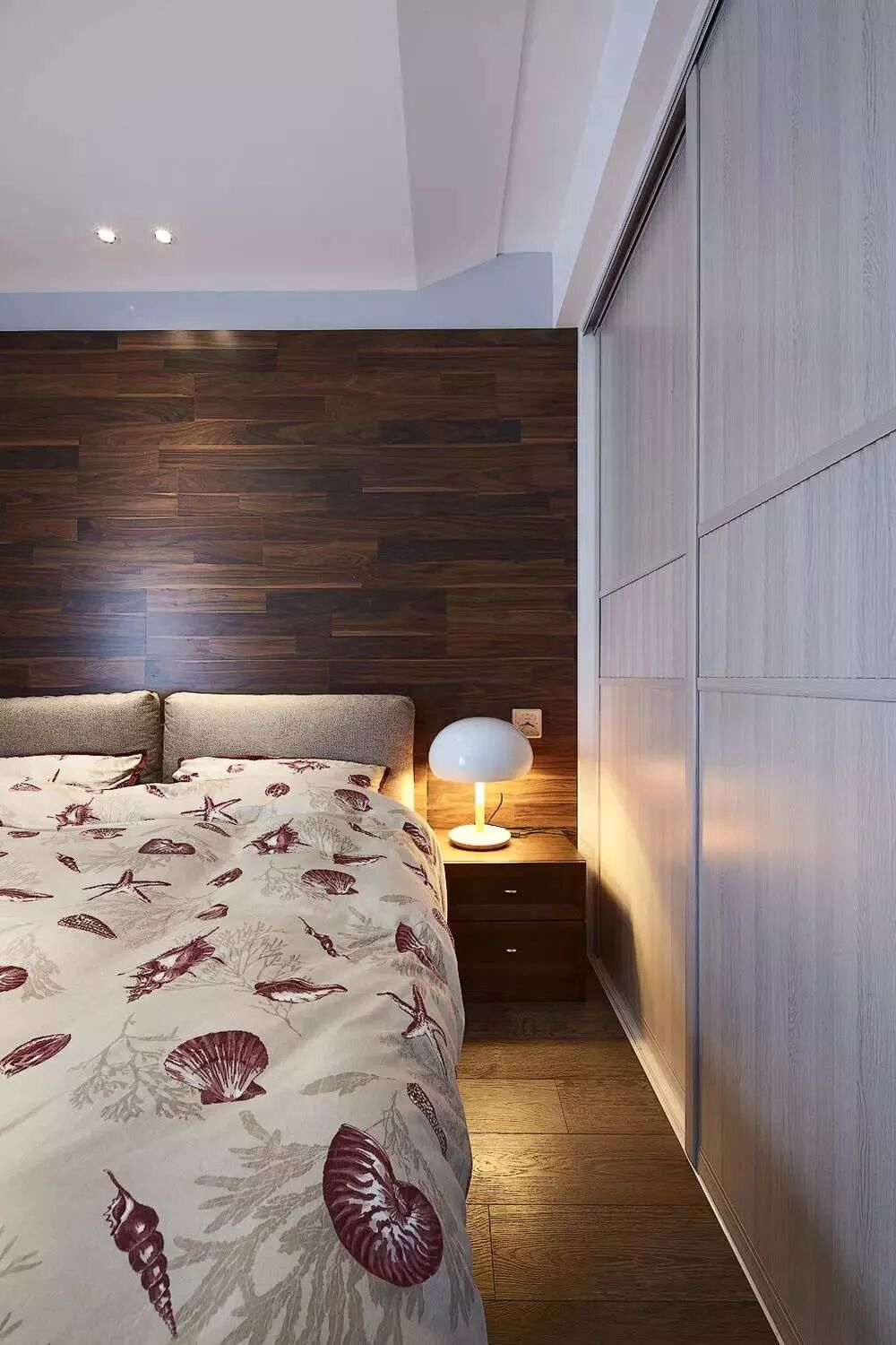 卧室背景用了独特的地板上墙工艺,在各道光源交互投映下,铺陈出一室的自然浪漫。