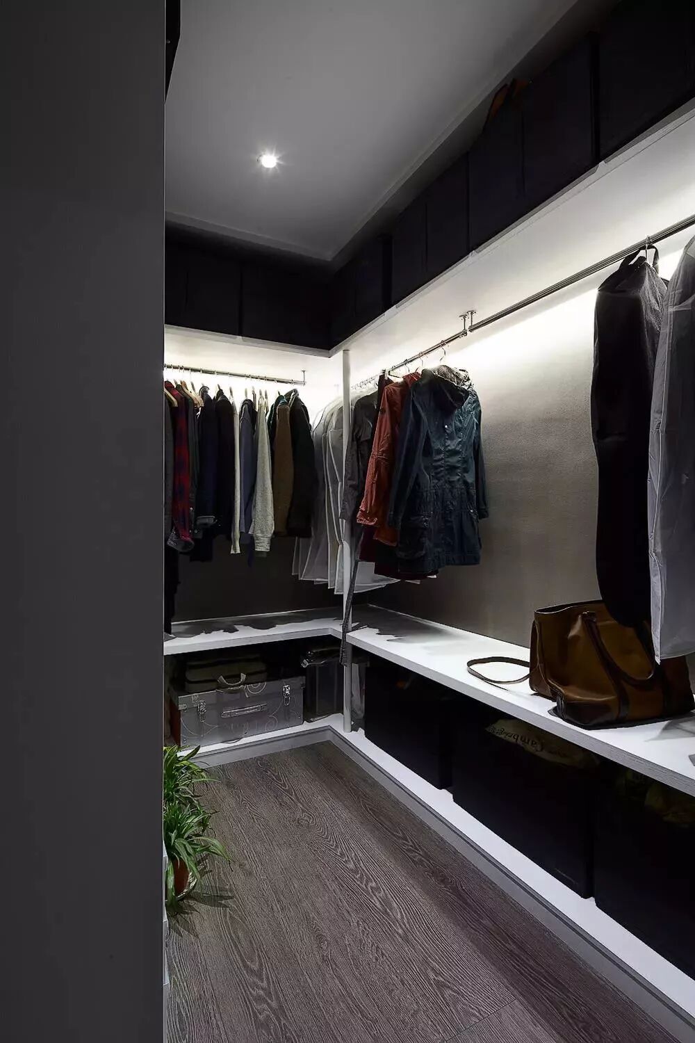 衣帽间背景用了深灰色墙纸处理,加上暗藏的灯光带,私人空间也有了小生机。