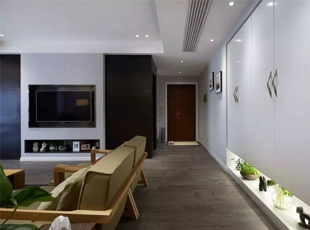 橡木染色墙面,黑色金属的电视背景,间或浅灰色涂料来调和,各具一格又彼此相融。