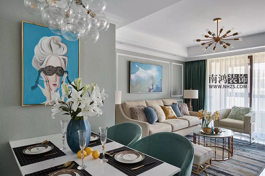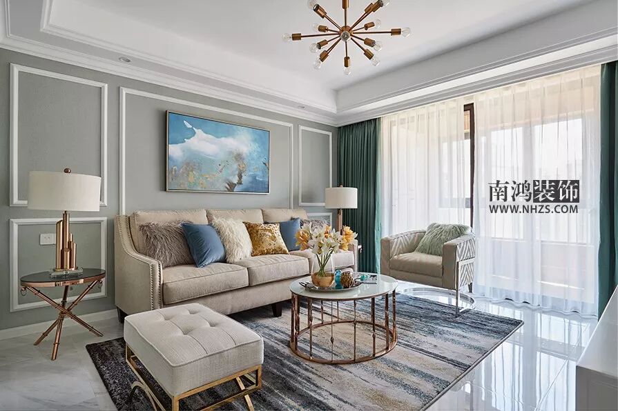 客厅的沙发茶几地毯等软装颜色都素雅清淡,整体避开暗沉的色泽,同色系的沙发中添了一款蓝色的单椅沙发,打破了原有的规整感,显得灵动不再古板。