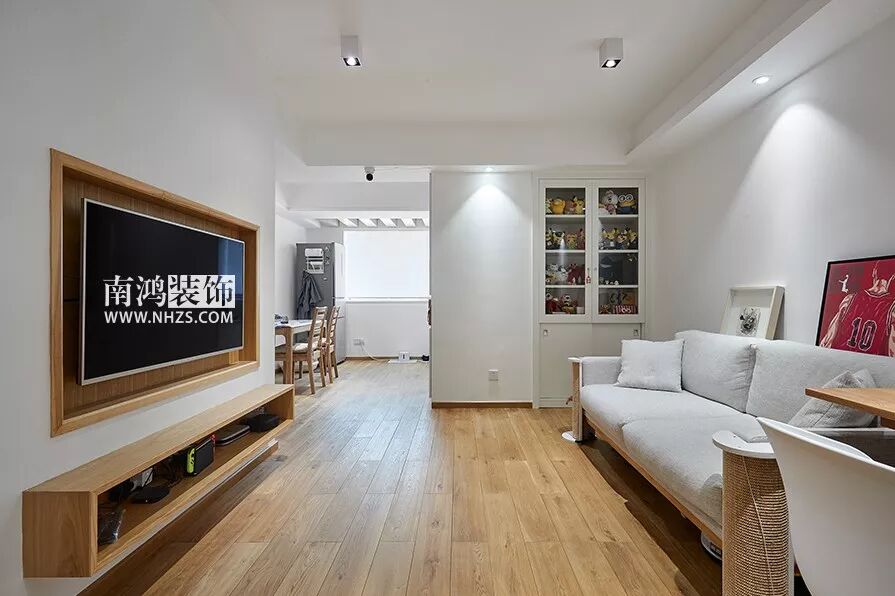 这是一套位于青园的70方的日式小屋,户型较为狭长,设计师在设计的过程中贴近自然,注重功能,将自然的平和淡然融入生活里。入门处设计师规划了一堵白墙,形成一方小小的玄关,避免进入室内便直面客厅,捎带着担任了电视背景墙的功能,充满人性化。