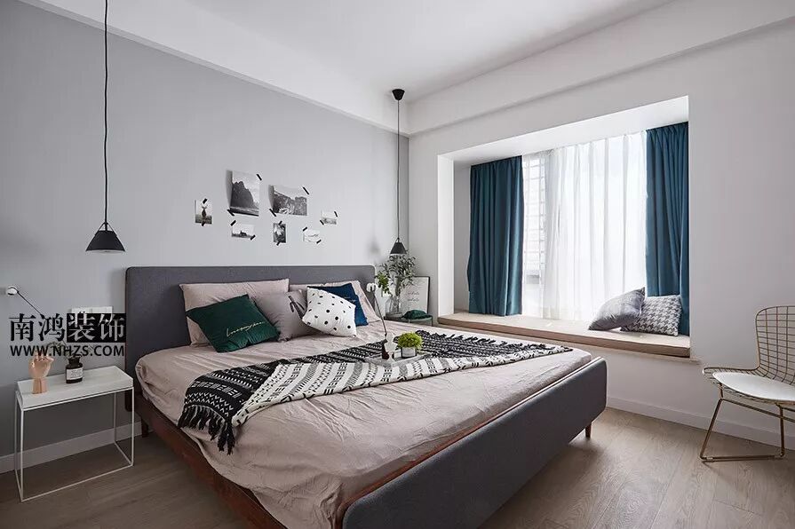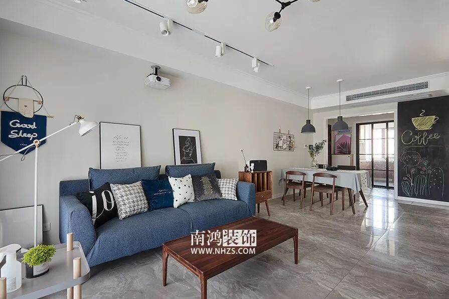 原本按照户型结构,大门正对卫生间,于是设计师设计了一个玄关作为隔断,在设计过程中围绕着舒适和实用的核心,运用原木色护墙板与白色文化石的结合,配合蓝色沙发及黑色主灯整体打造休闲温馨的居家环境。