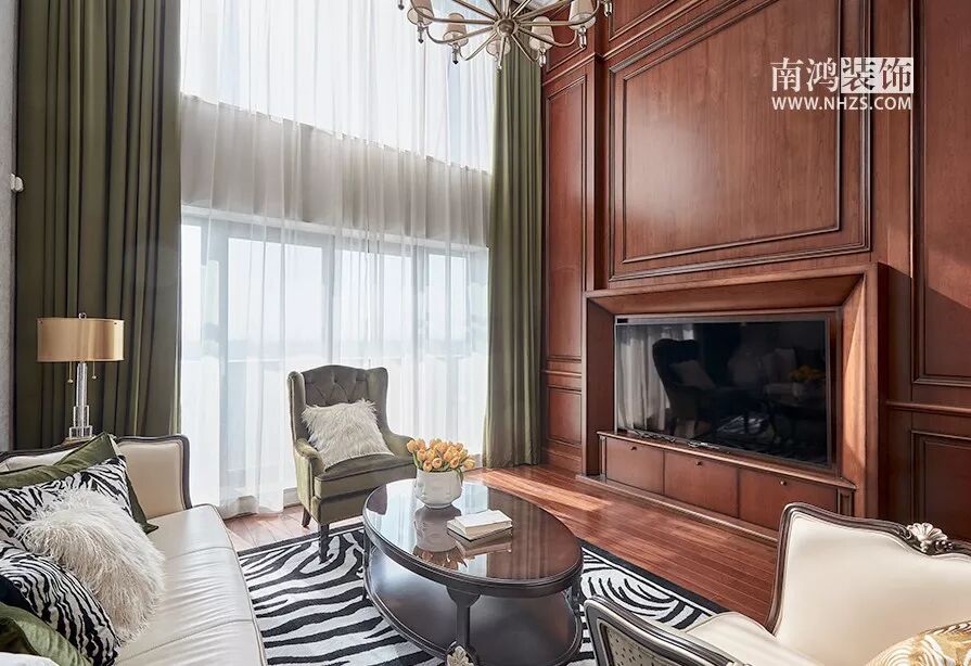 本方案为精装房改造,屋子自带深色护墙板与实木地板,有年代感缺时尚感,所以设计师在软装搭配上注重与大空间的和谐融入。金橄榄色作为主要的点缀色,窗帘和单椅的色系在整个空间里运用得恰到好处。