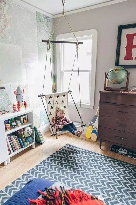 ▼在卧室里装一个小吊椅看起来不错~在保证安全的情况下,家庭中适当的娱乐和消遣有助于培养孩子活泼开朗的个性。
