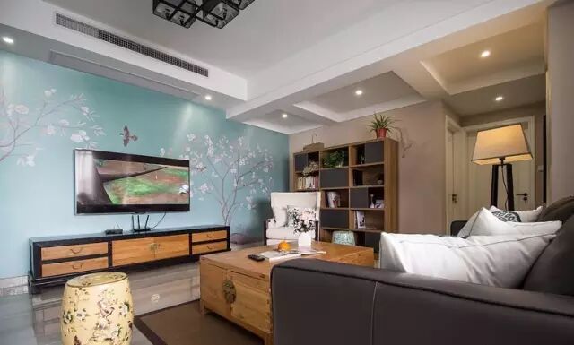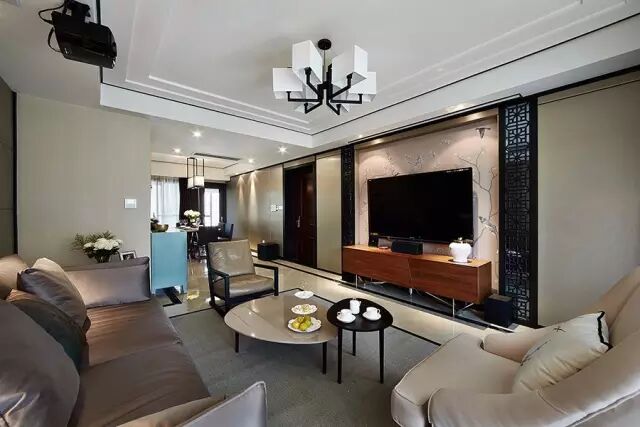 ▲ 新中式一般也会简化硬装,为了增加中式元素,也可以选用花鸟壁纸做电视背景,效果也不错