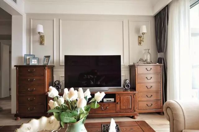 ▲ 美式风格经常会用线条在墙面勾勒造型,最常见的是三分造型,依照中轴线对称,壁灯和斗柜也是常用的搭配