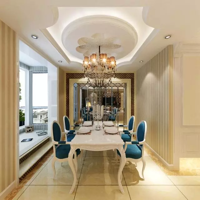 白色素雅的餐桌配上蓝白相间的座椅的搭配,精巧线条涡状曲折的桌椅腿,餐桌上欧式灯座蜡烛的配备,更显欧式浪漫风情。