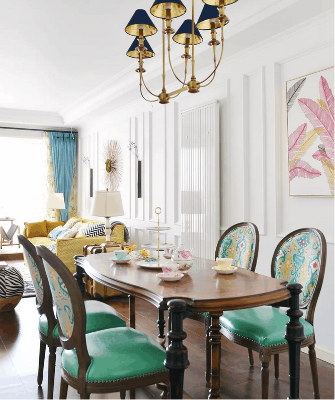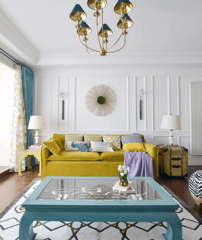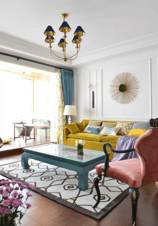 客厅设计在颜色选择上比较大胆,色彩很活跃,颜色多而不乱,亮而不闪,优雅不俗。
