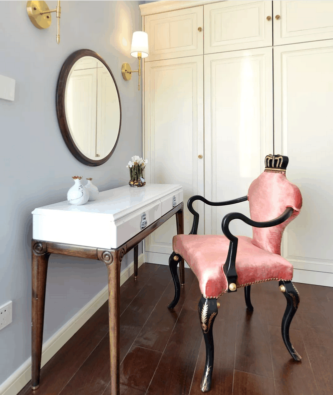 优雅的浅蓝灰色墙面特别利于睡眠,淘来的梳妆台和女王座椅都是女主的心头爱。