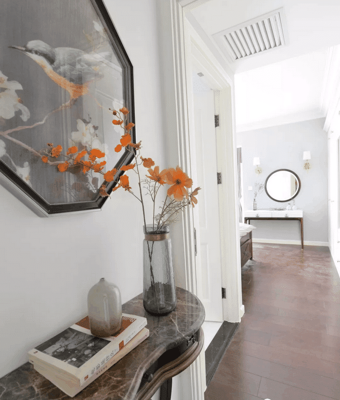 看似老旧的中式木柜,搭配一件中式的花器,和简单的插花,这样的混搭显得别致又富有韵味。