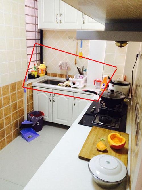 因为户型问题,我们家的橱柜是L型的,长的一边是灶台和操作台,短的放了两个小水槽。装修时觉得这是最好的设计了,但入住后才发现很不方便,水槽这边位置不多,洗的碗和菜都没有地方放,只能放在另一个小水槽上,而洗洁精和抹布只能放在窗户边,要多不方便就有多不方便。
