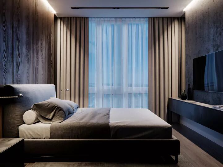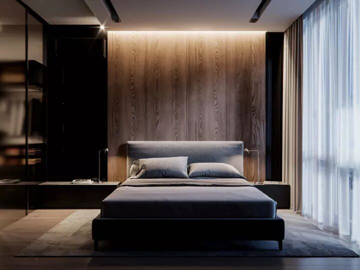 虽然大体上还是以黑白灰+原木为主打色,不过有了巧妙的光源设计,卧室会立刻变成温馨的、有生命力的居心地。