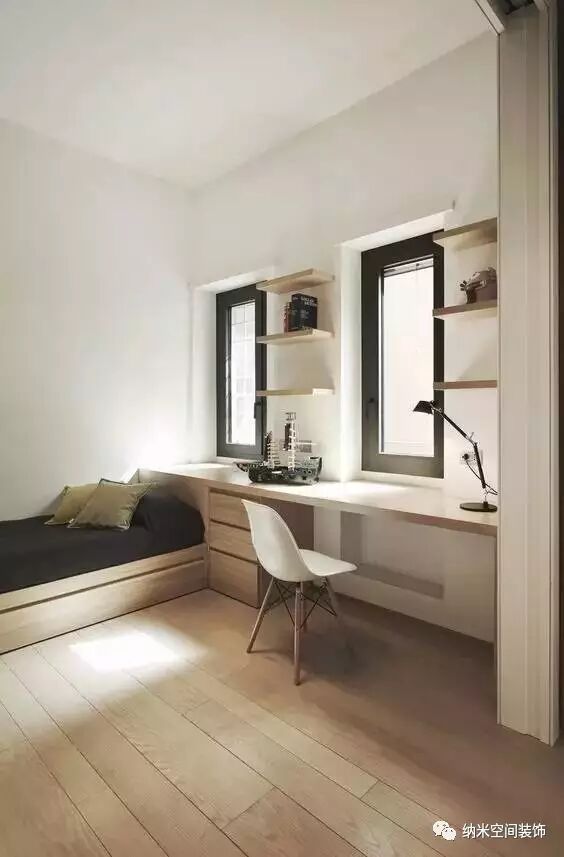 除了传说中的现实很难买到的折叠式或隐藏式家具外,还有一个比较可靠的方案就是“榻榻米+柜+书桌”组合,接下来就直接为大家分享几个案例:
