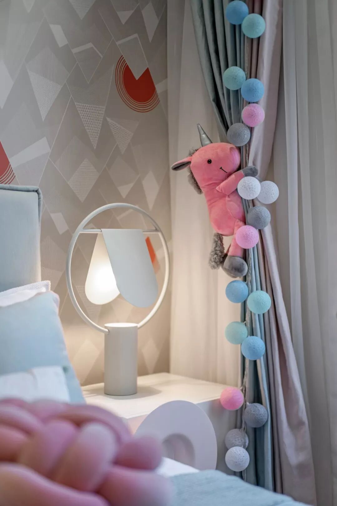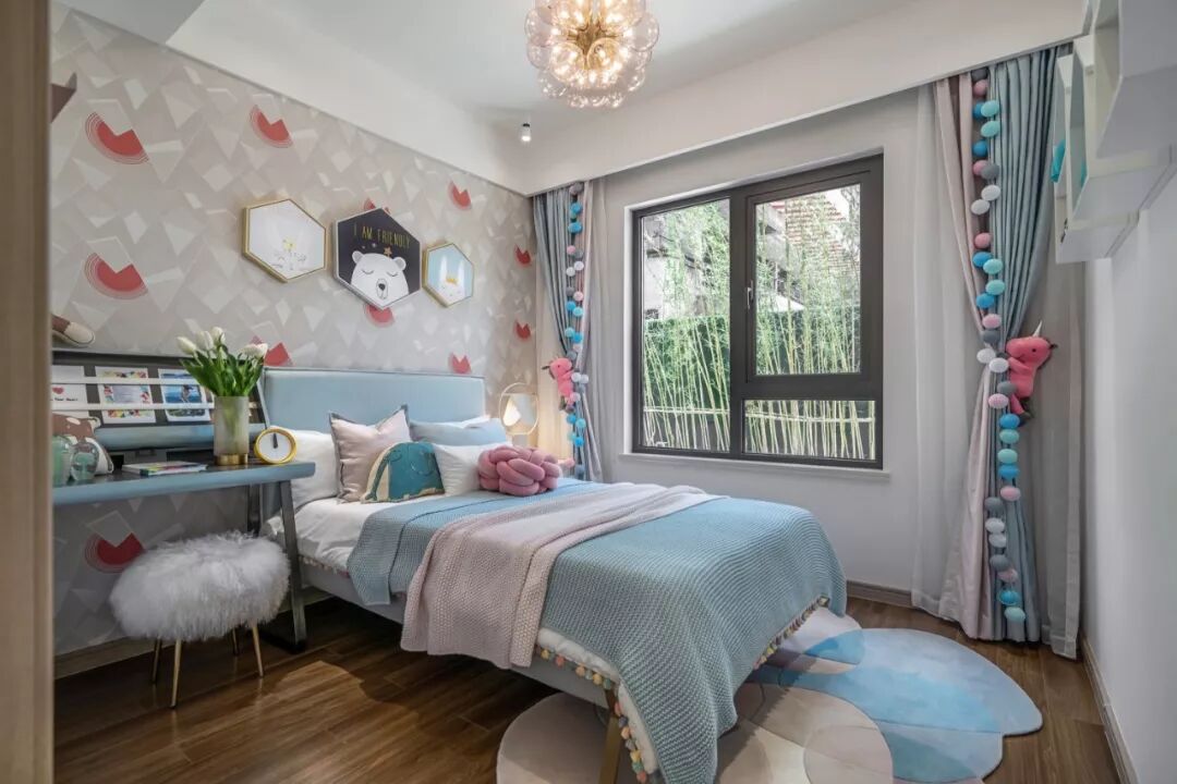 儿童房大面积使用蓝色,粉色点缀其间,高调的配色使空间洋溢着活泼、纯真的氛围。小独角兽、小象、小熊、小兔子都将成为童年的玩伴与不可或缺的美好记忆。朦胧的灯光散发着温暖恬淡的光芒,宛如梦境入口,纯真的美梦正在心底化开。