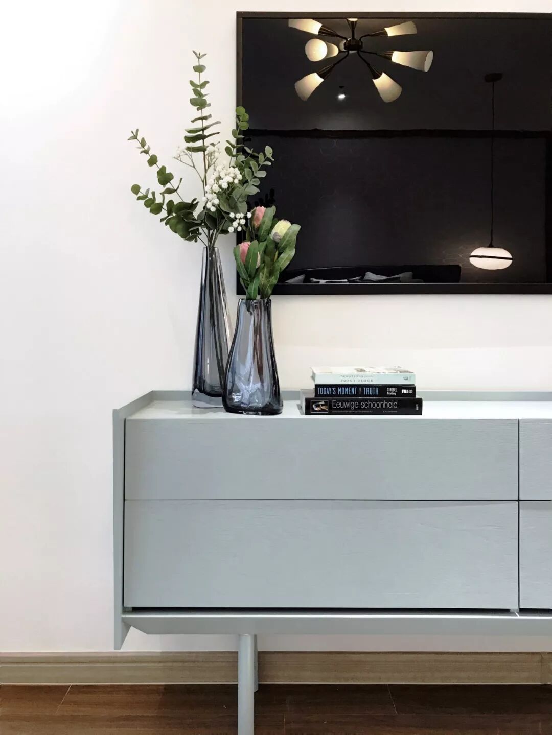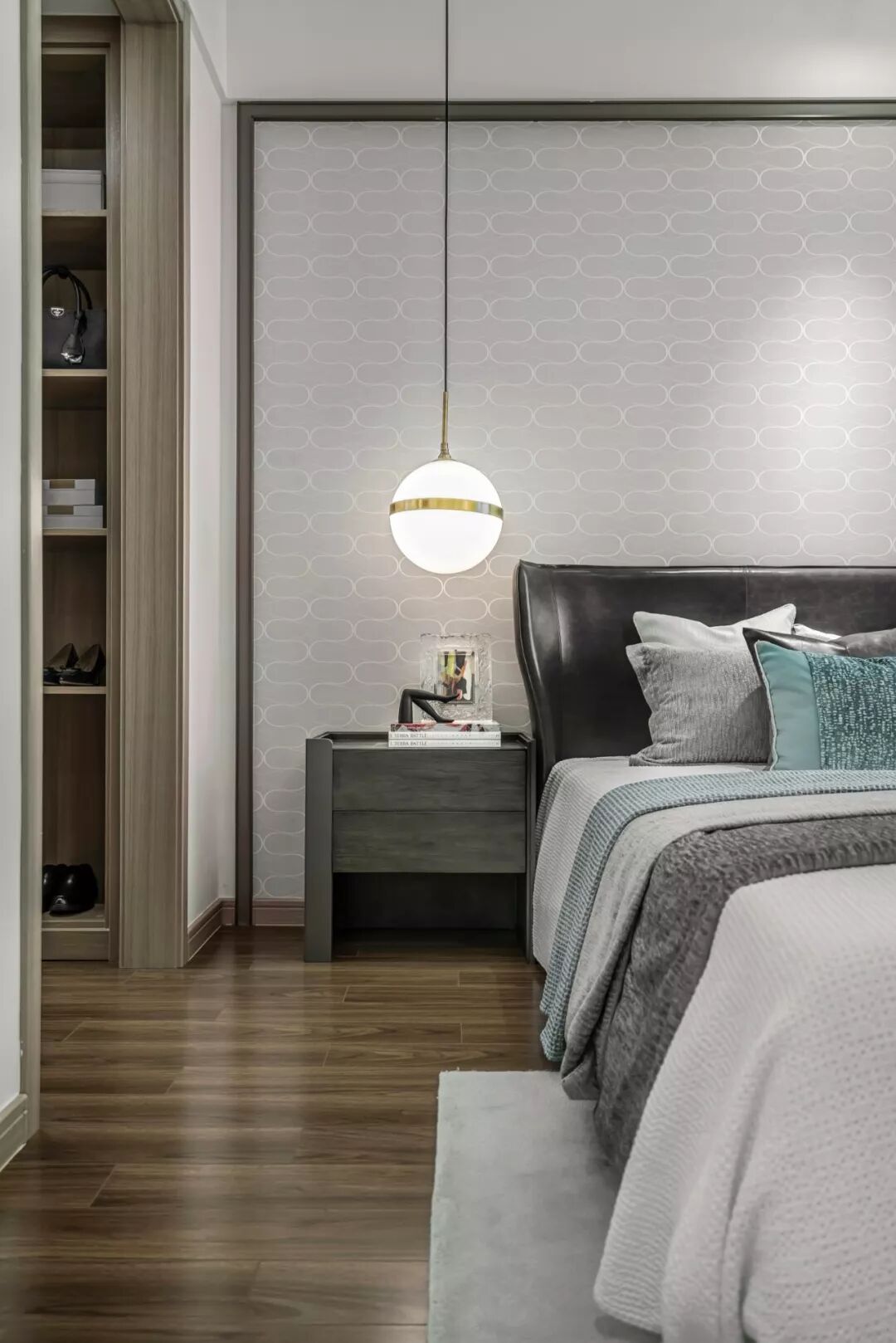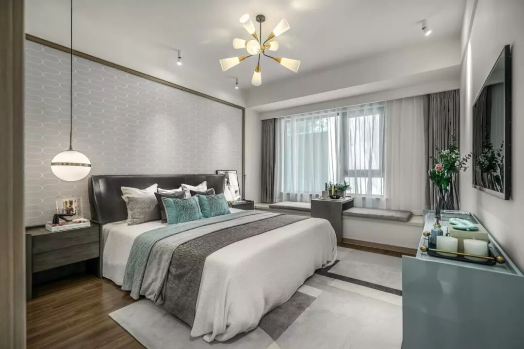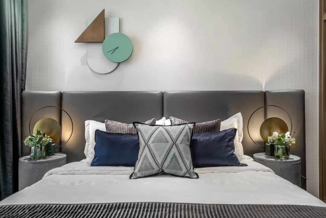 卧室以优雅灰、蓝色调与简洁的几何形装饰品为主要元素。低纯度、对比弱的灰色背景墙,即使大面积使用也不会有强烈的感觉,再搭配空间不同明度的灰色,使空间更具层次感,尽显知性柔和。在以无色彩为主的空间中点缀以Tiffany蓝,削弱了空间单调、乏味的印象,赋予空间更丰富的活力。