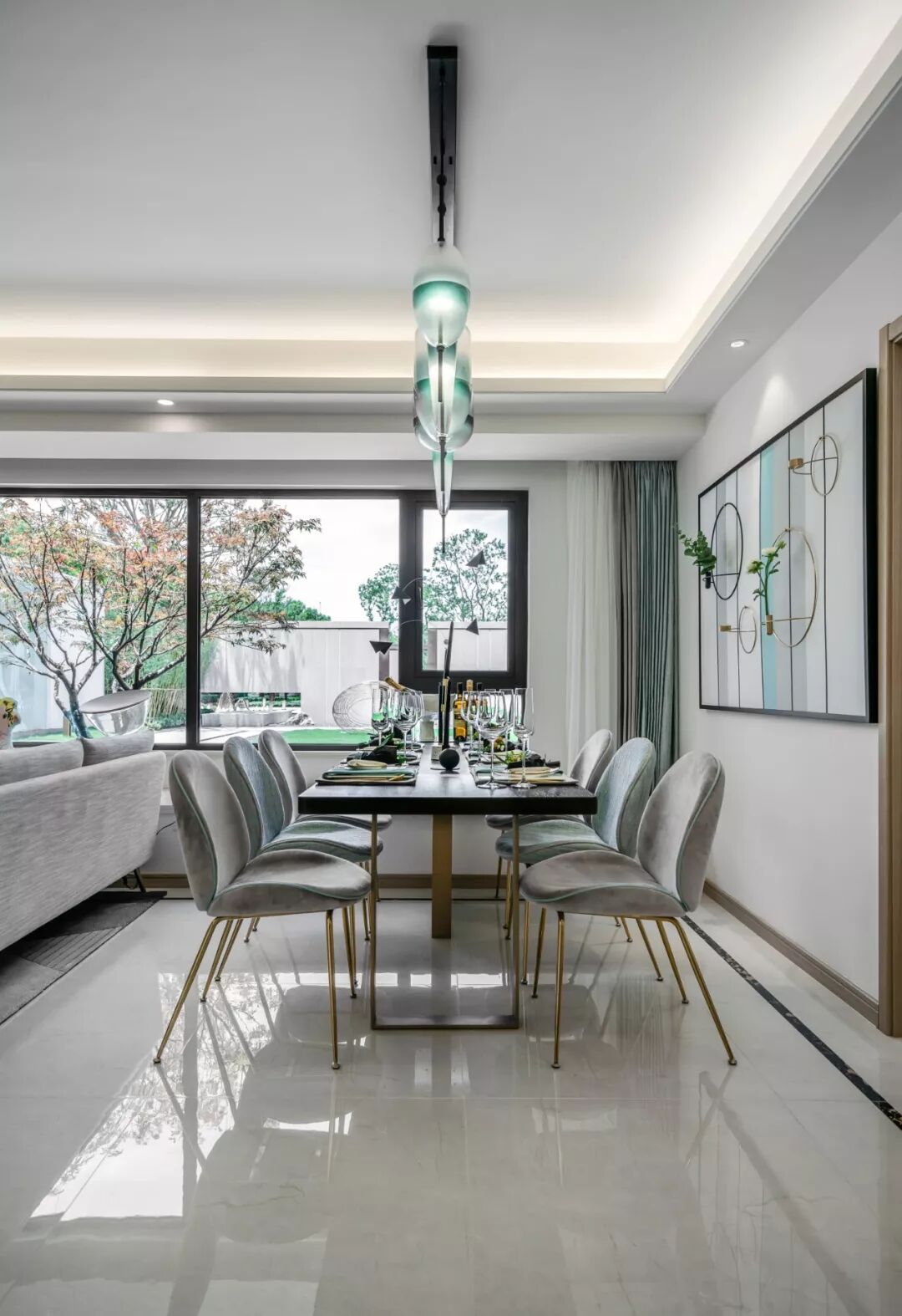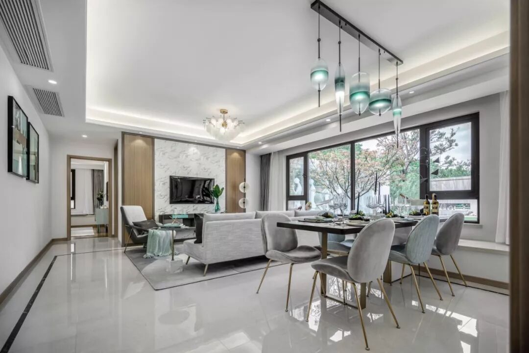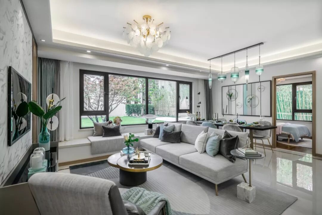 起居室优雅柔和,低调静谧的空间气质,令人格外的迷恋。设计师巧妙的将飘窗与沙发和餐桌相连,视觉更加通透的同时也使室内与室外有了极好的互动。