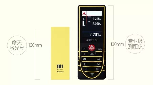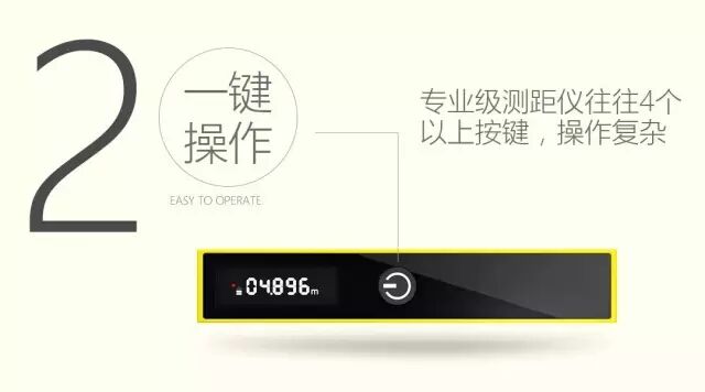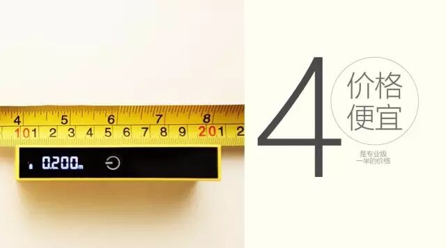 脱胎于专业激光测量技术的摩天激光尺,舍弃了专业领域的面积测量、对角测量、任意两点距离测量等。同时根据家庭日常应用场景,做了很多体验式优化。比如:简化了复杂的功能按钮,做到真正一键测量,达到方便生活的目的;通过技术和工艺创新,实现单体最薄,达到轻巧便携;优化工业设计,提升时尚品味,确定家庭式升级消费的定位。