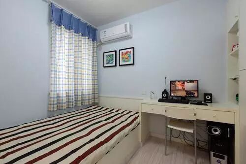 墙面刷成了粉蓝色,还准备了个简易书桌和书架,挺实用的,算是一个比较独立的空间了。