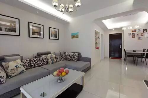 整洁大气,颜色搭配的也挺好的,挺喜欢这款沙发的,软硬适中坐着挺舒适的。窗帘选择了银灰色的,搭配上白色窗帘纱,挺好看的。