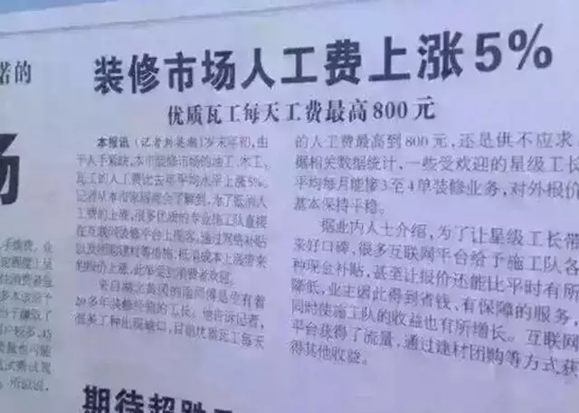 人工费只涨不跌,年后装修人工材料即涨5%—10%。