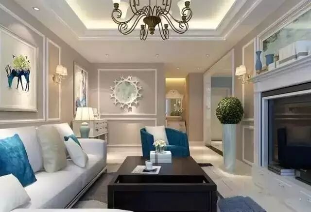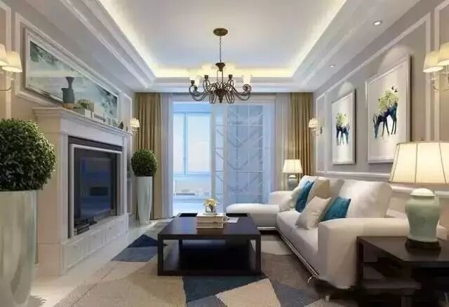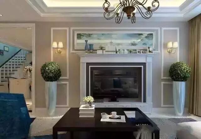 客厅的墙面上没有过多的装饰,只是使用了白色的元宝线做了造型,再加上乳胶漆的颜色,也是让客厅不再那么的单调。壁炉的设计与电视背景墙的搭配也是为客厅增添了一份色彩。