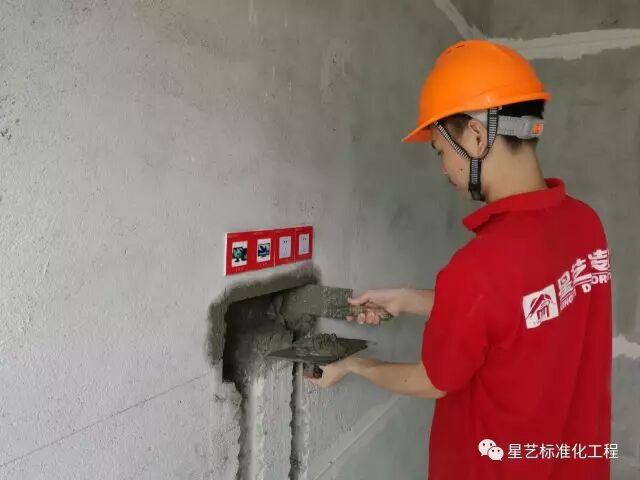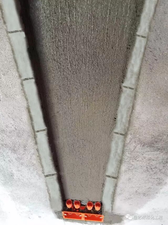 (2)100mm以上宽度线槽应以底盒杯梳后壁为基准点用水泥砂浆做找平处理,预防封槽时砂浆无法填充而造成空鼓。