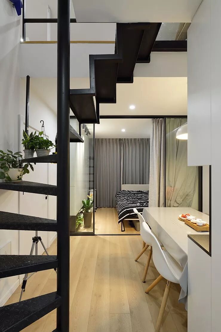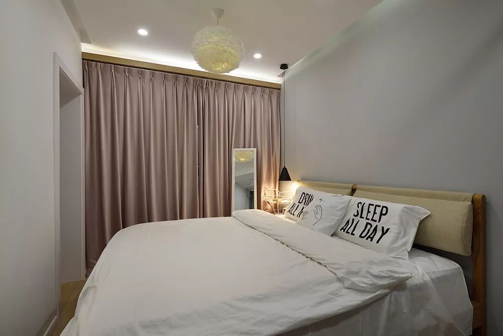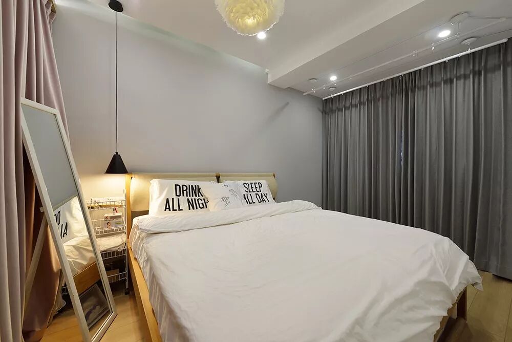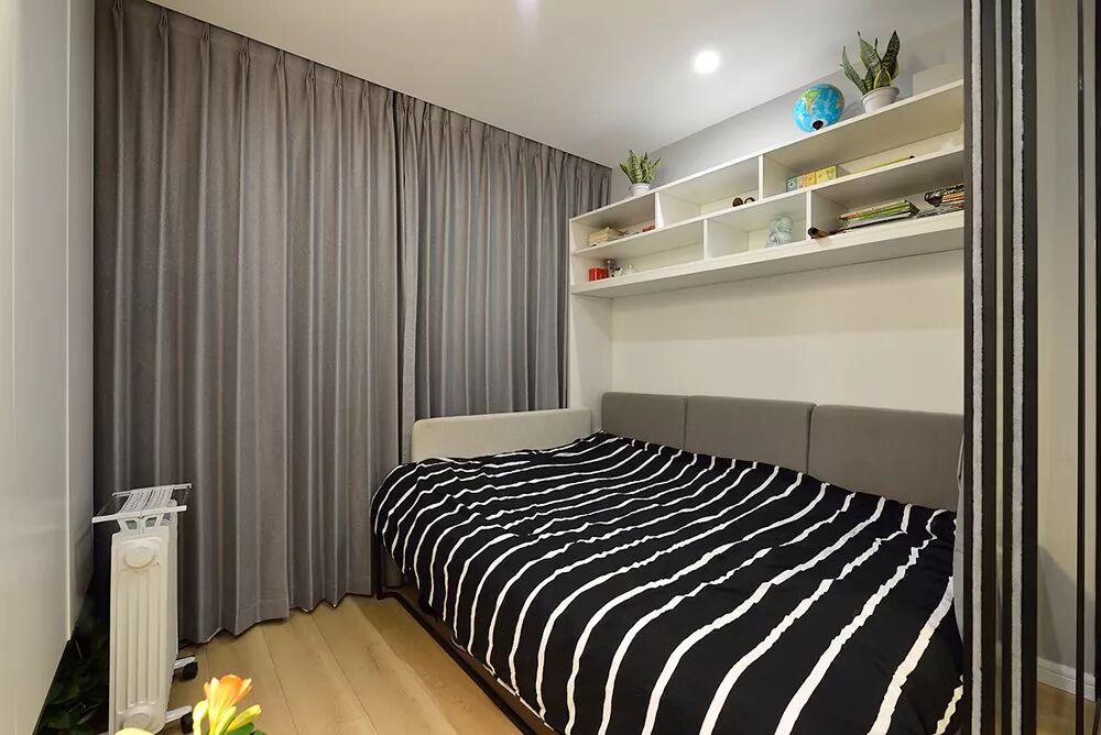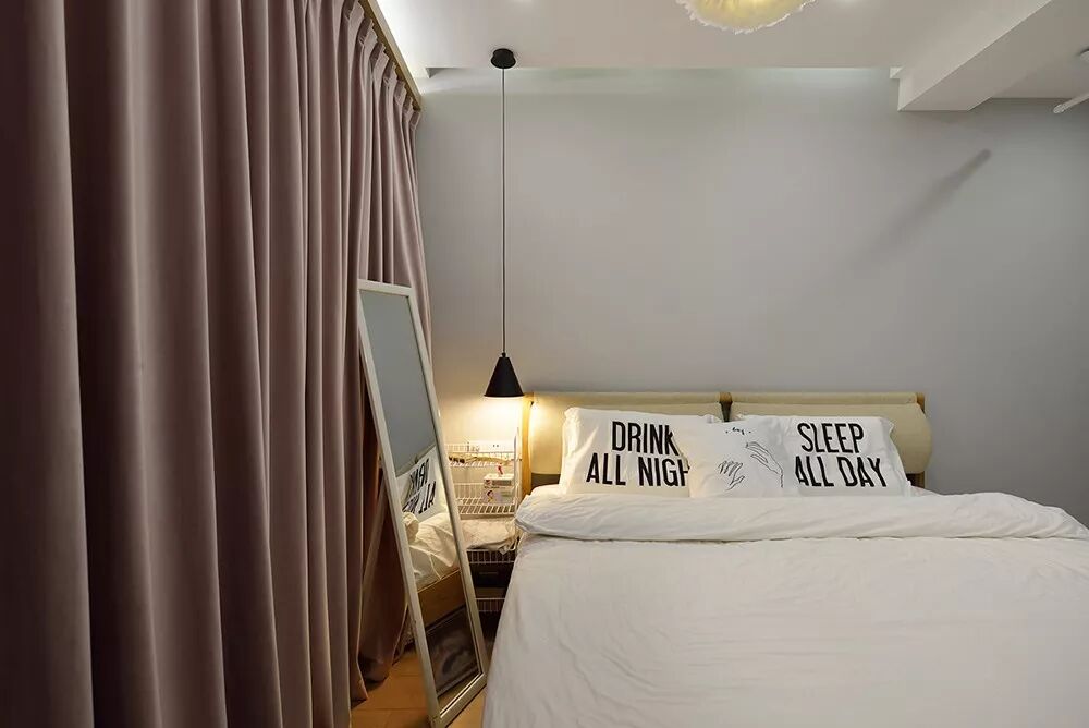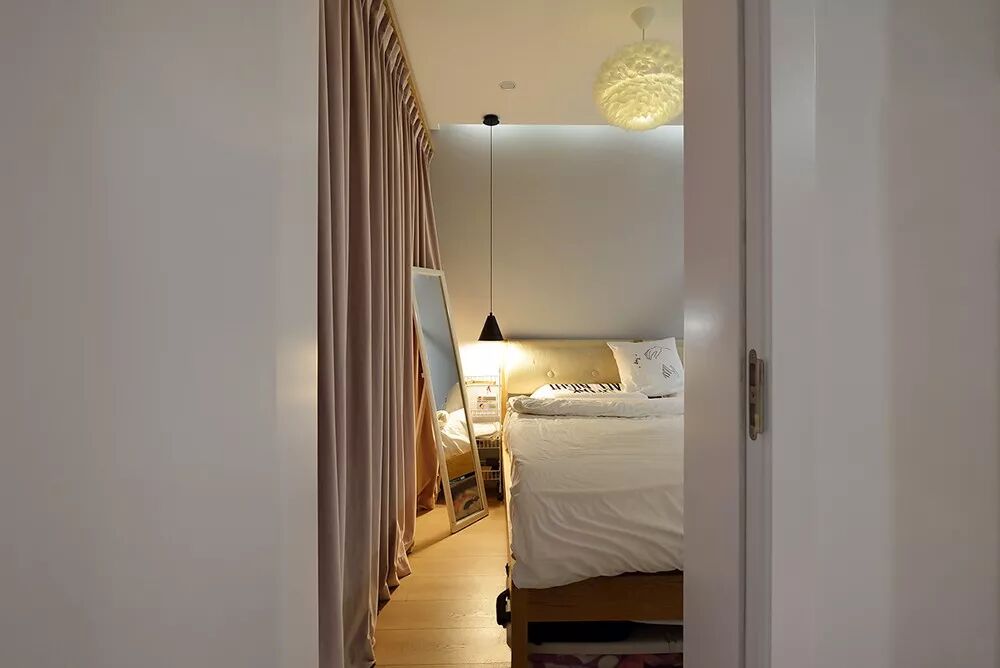 通过改动房门位置成功开辟出一个衣帽间,一道厚重的布帘既实现了遮挡的目的,也节省了造价和开门空间。