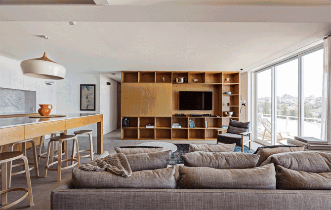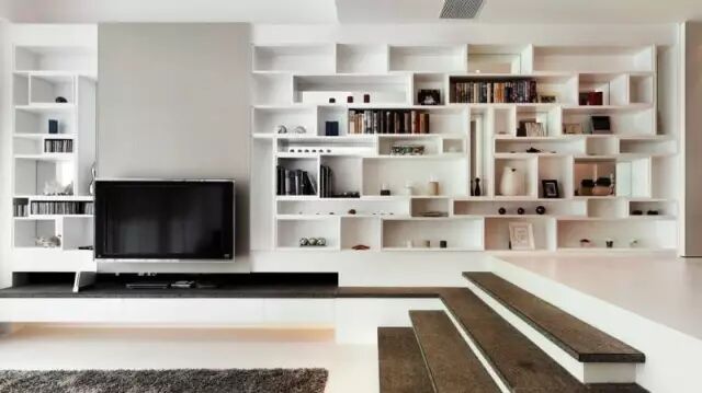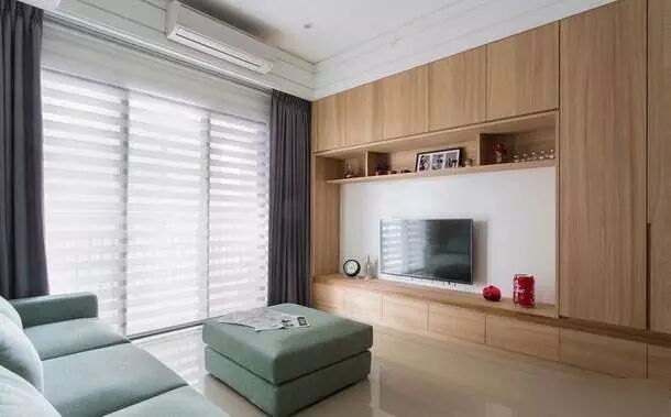 如果重视收纳功能多于空间的简洁程度,可以试试在电视背景墙和沙发背景墙上下功夫。