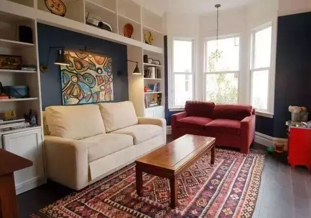 (小编不建议采取图中增设书架的方式,沙发与墙有一段距离,易向后移动撞到后面的壁柜式书架。)