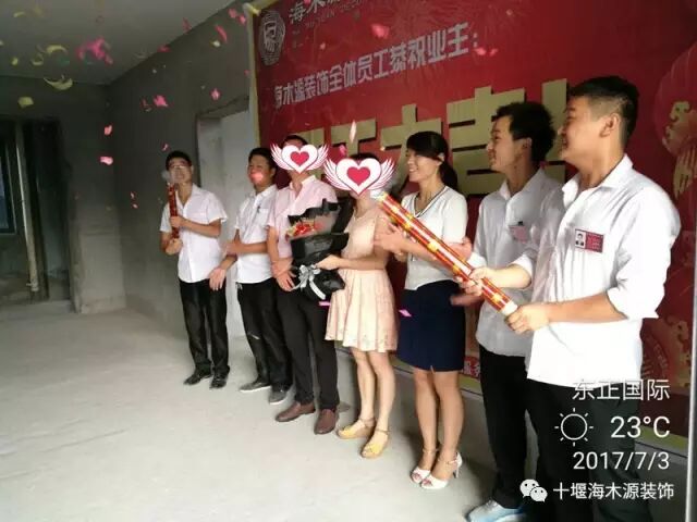 公司员工与业主合影~礼花响起,预示着一切都会红红火火。